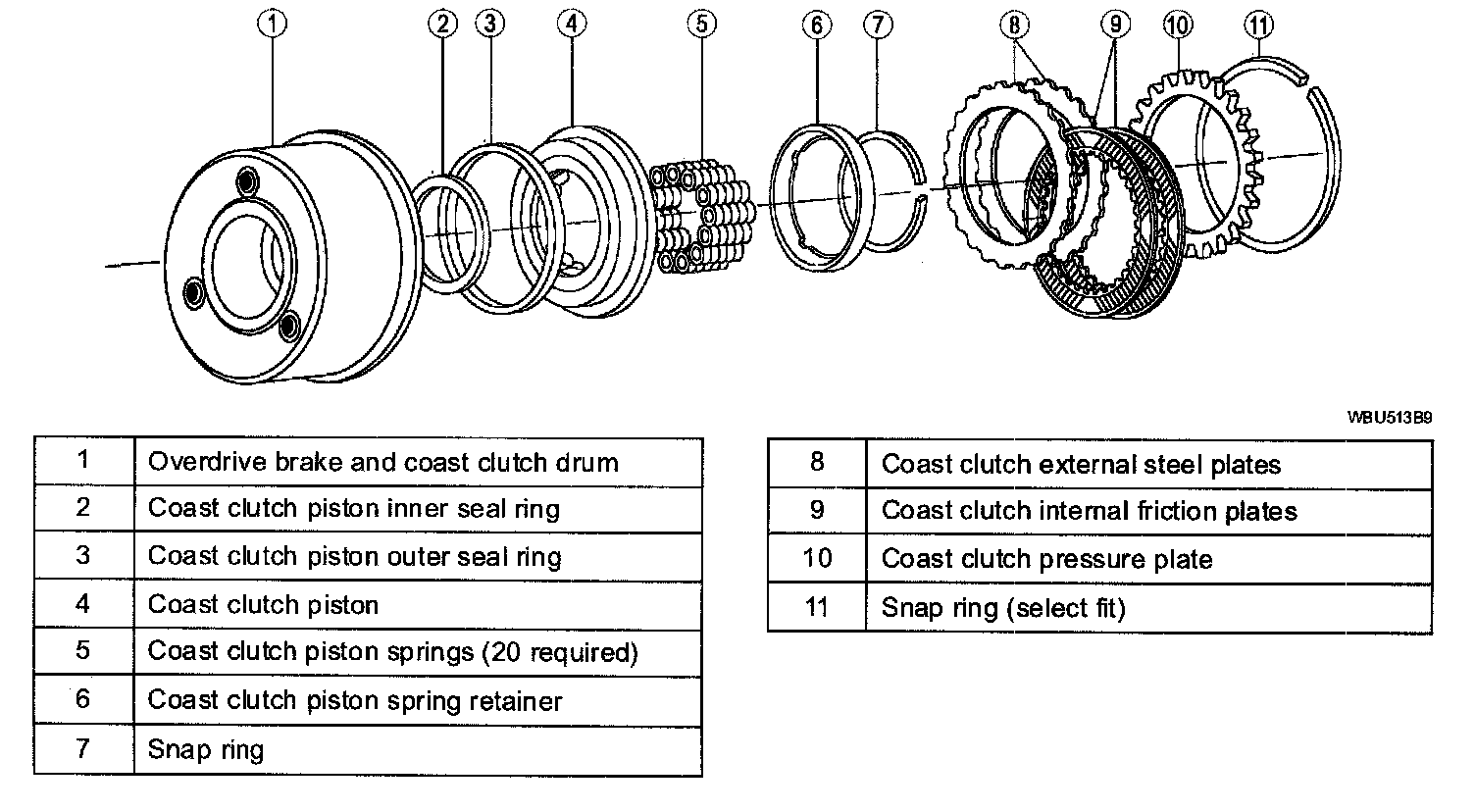 The coast clutch is a mufti-disc clutch made up of steel and friction plates. The coast clutch is applied with hydraulic pressure and disengaged by return springs and the exhaust of the hydraulic pressure.