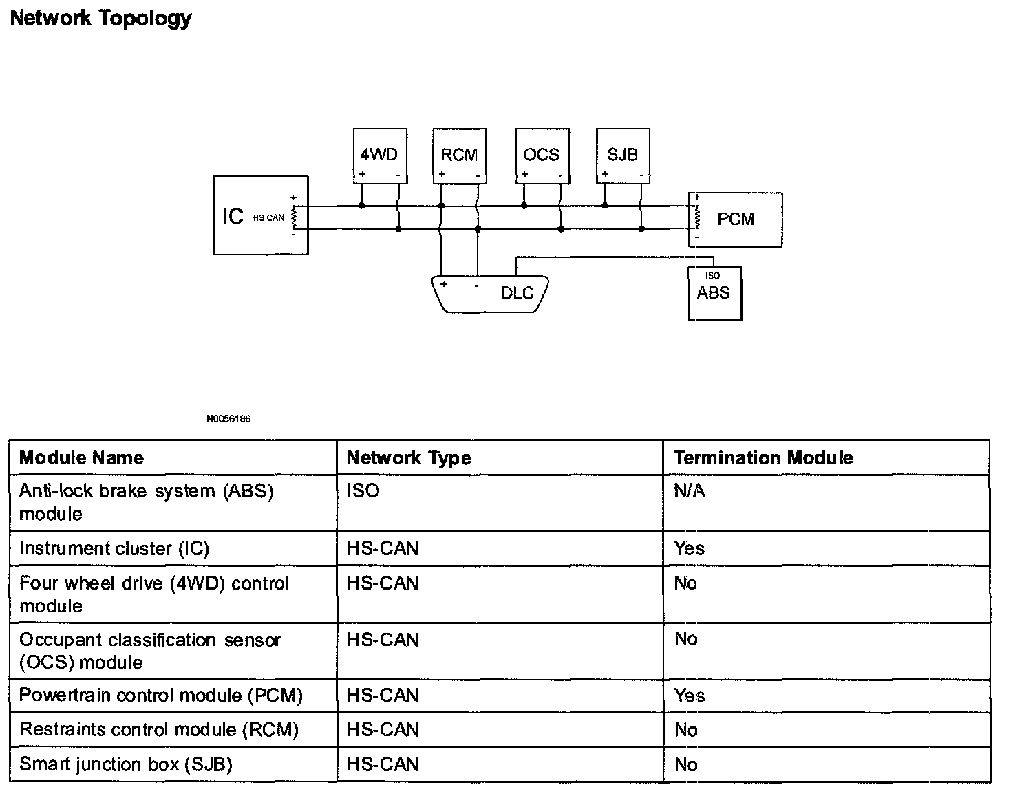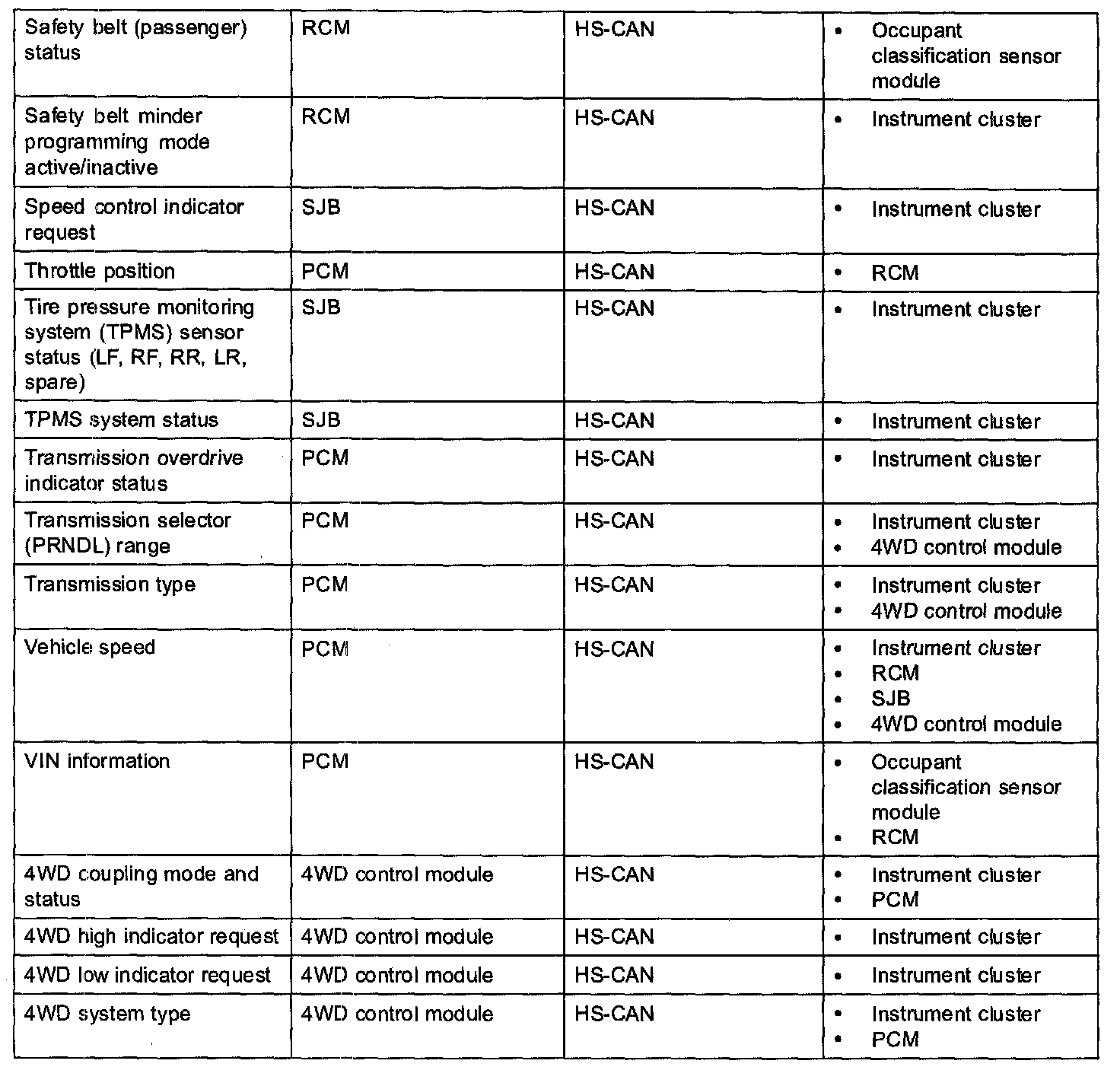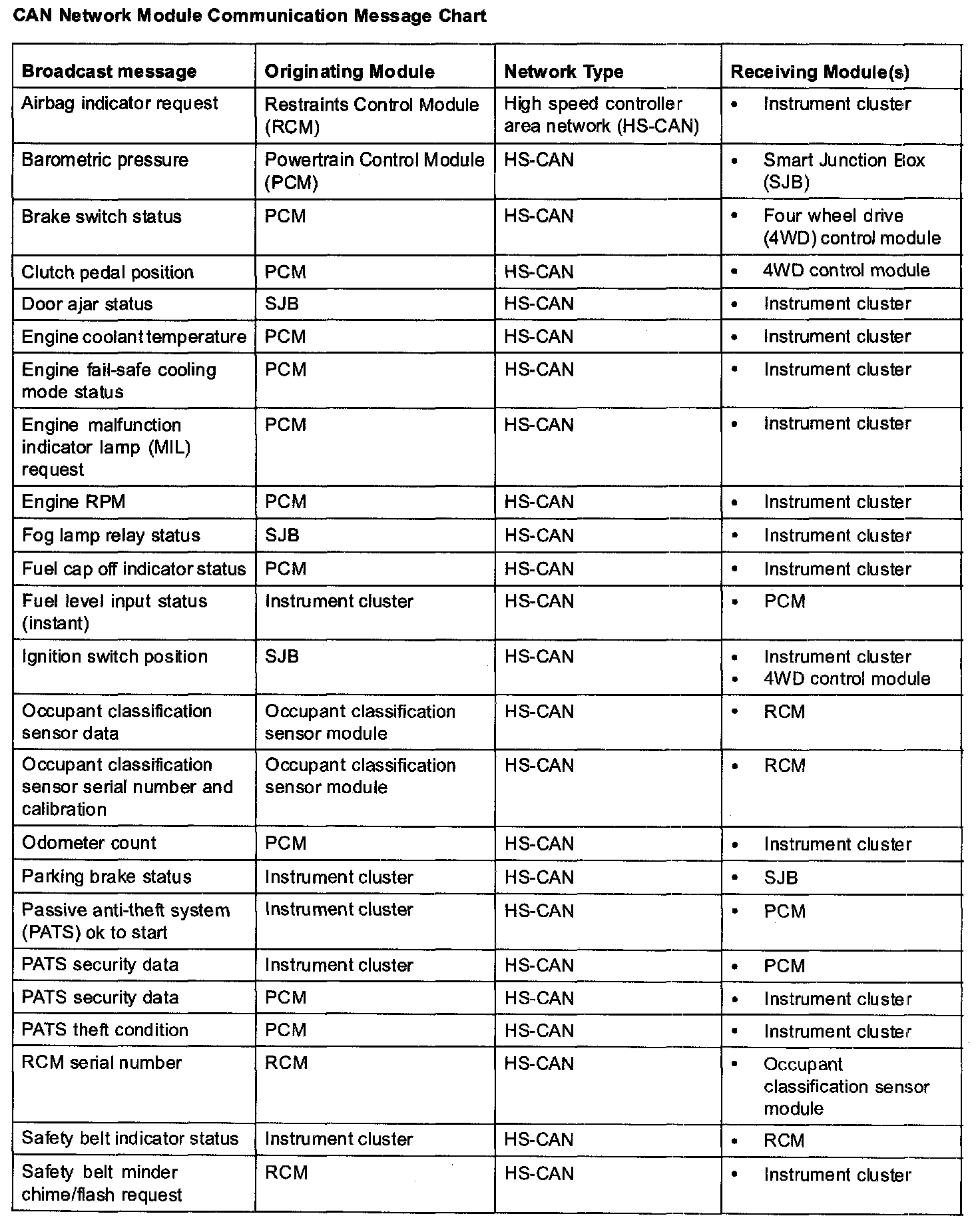 The HS-CAN network uses an unshielded twisted pair cable of data (+) and data (-) circuit. The data (+) and the data (-) circuits are each regulated to approximately 2.5 volts during neutral or rested network traffic. As bus messages are sent on the data (+) circuit, voltage is increased by approximately 1.0 volt. Inversely, the data (-) circuit is reduced by approximately 1.0 volt when a bus message is sent. Multiple bus messages can be sent over the network CAN circuits allowing multiple modules to communicate with each other. The HS-CAN is a high speed communication network used for the instrument cluster, the powertrain control module (PCM), the four wheel drive (4WD) Control module, the restraints control module (RCM), and the occupant classification sensor module communications, and designed for real time information transfer and control. The HS-CAN network will not communicate while certain faults are present, but will operate with diminished performance with other faults present. The HS-CAN bus may remain operational when 1 of the 2 termination resistors are not present.