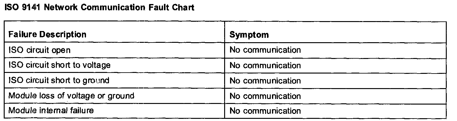 The following fault chart describes the specific ISO 9141 network failures and their resulting symptom.