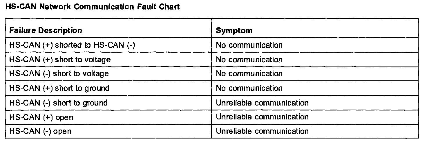 The following fault chart describes the specific HS-CAN network failures and their resulting symptom.