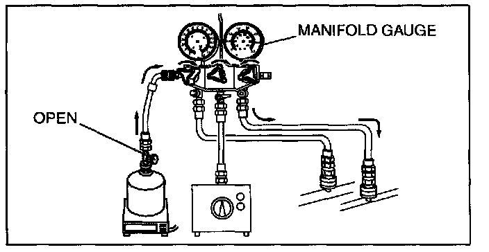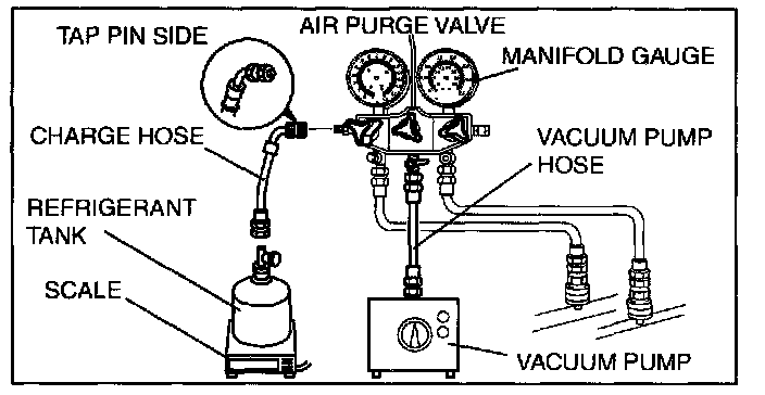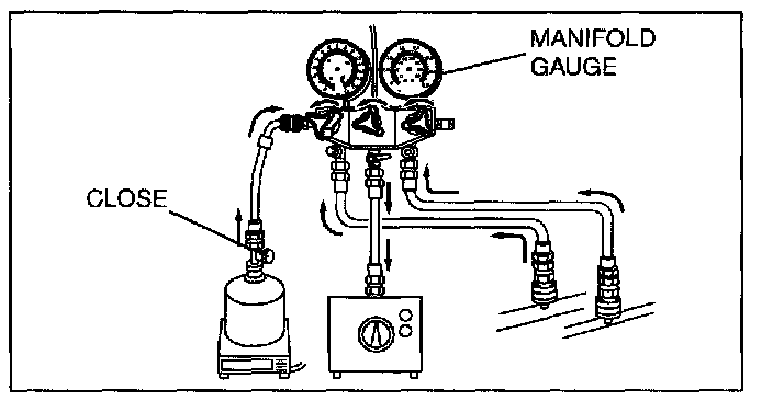 CAUTION: Close the manifold gauge valve immediately after stopping the vacuum pump. If the valve is left open, the vacuum pump oil will flow back into the refrigeration cycle and cause a decrease in the efficiency of the air conditioner.