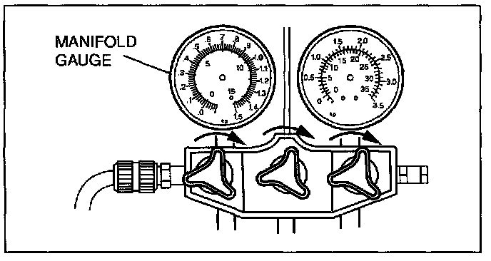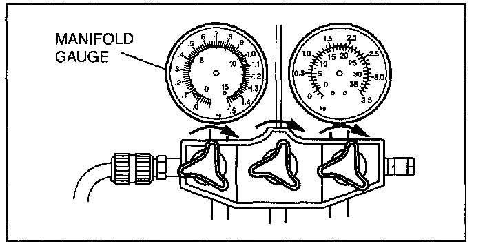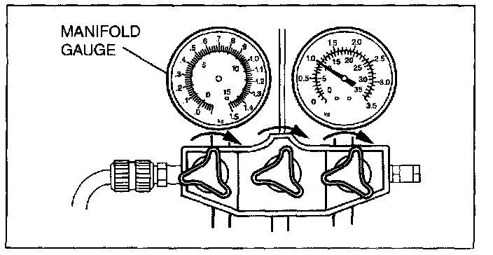 4. When the low-pressure side reading increases to 0.098 MPa {1.0 kgf/sq.cm, 14 psi} close the high- pressure side valve of the manifold gauge.