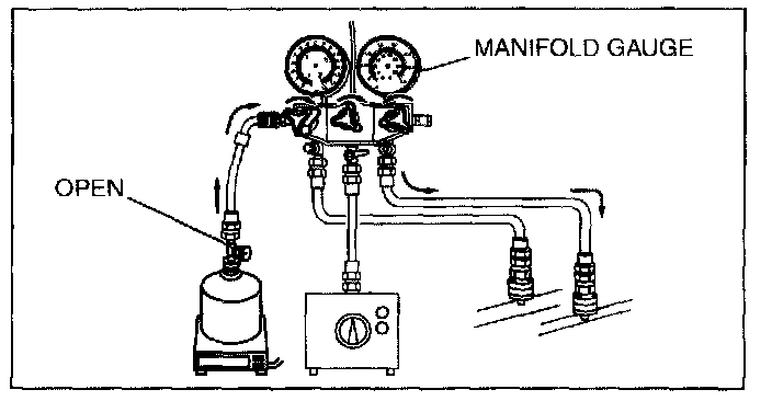 10. Open the low-pressure side valve of the manifold gauge and charge with refrigerant until the weight of the refrigerant tank has decreased regular amount from the amount in Step 2.