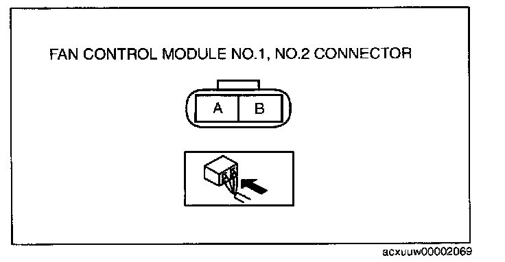 5. Measure the voltage at terminal A of the fan control module connector (2 terminals) as shown in the table.