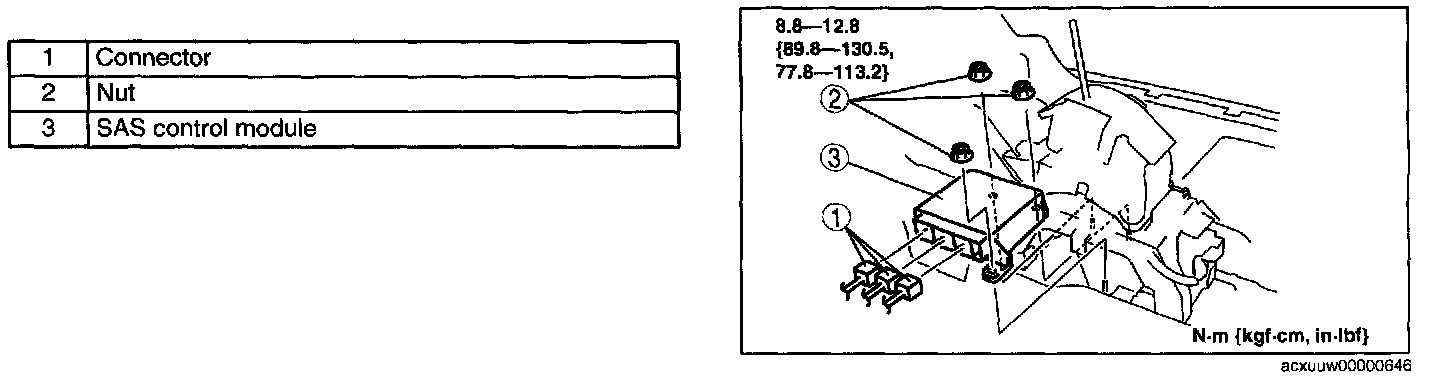 - Connecting the SAS control module with the SAS control module not securely fixed to the vehicle is dangerous. When the ignition switch is turned to the ON position, the SAS control module could tilt causing the SAS control module to detect that the vehicle is in a rollover condition, which may accidentally operate (deploy) the curtain air bag module and pre-tensioner seat belt. Therefore, before turning the ignition switch to the ON position with the connector connected, securely fix the SAS control module to the vehicle.