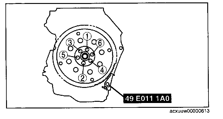 Tighten the new drive plate mounting bolts in two or three steps in the order shown.