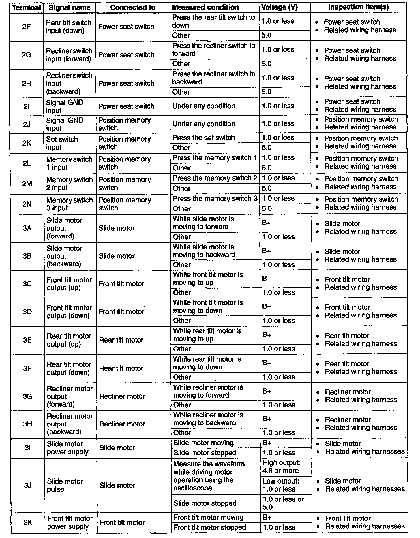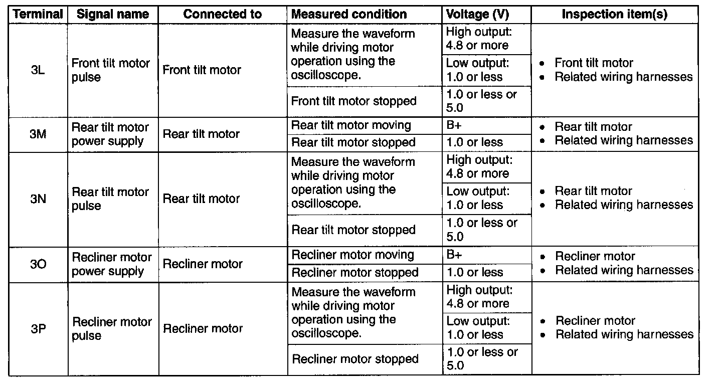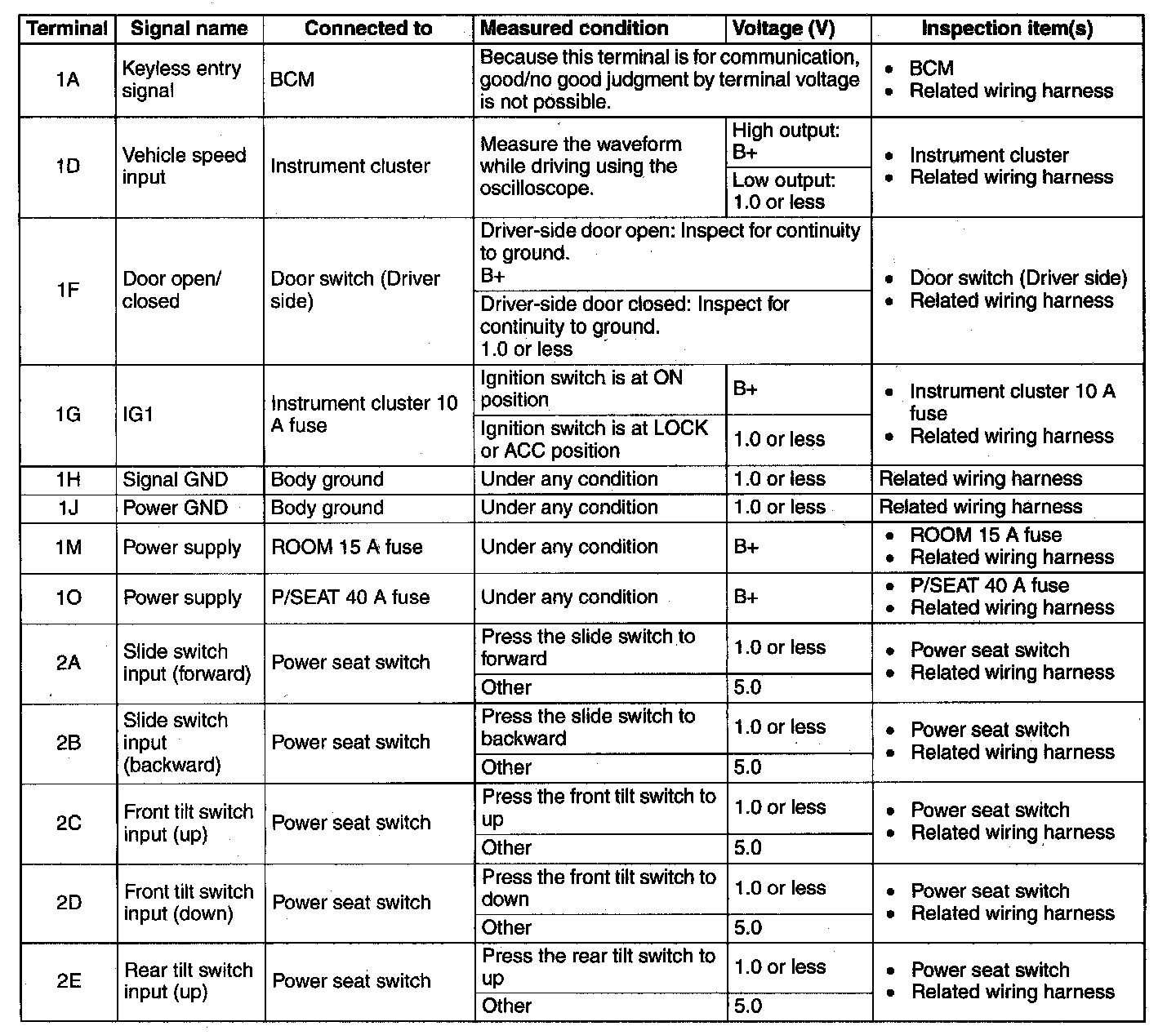 - It the voltage is not as specified in the Terminal Voltage Table (Reference), inspect the parts under "Inspection item(s)" and related wiring harnesses.