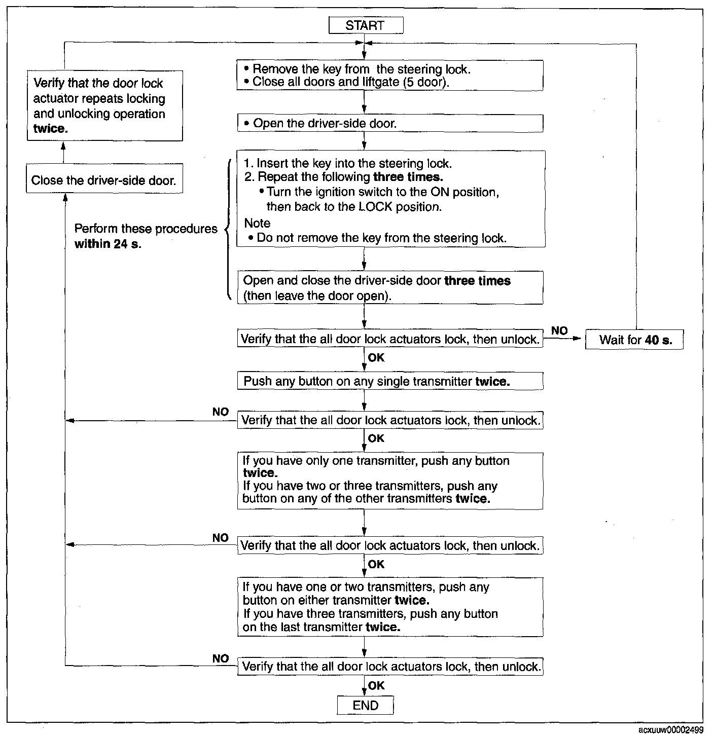 - After ID code registering, remove the key from the steering lock and verify that all doors lock/unlock normally using the transmitter.