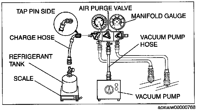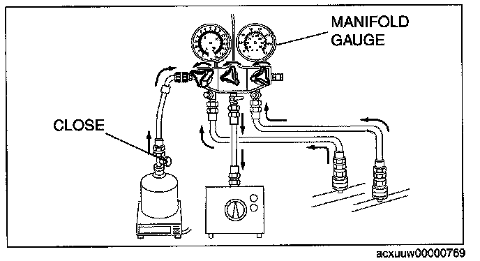 CAUTION: Close the manifold gauge valve immediately after stopping the vacuum pump. If the valve is left open, the vacuum pump oil will flow back into the refrigeration cycle and cause a decrease in the efficiency of the air conditioner.