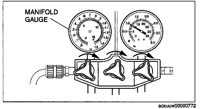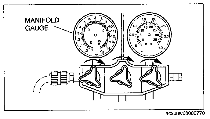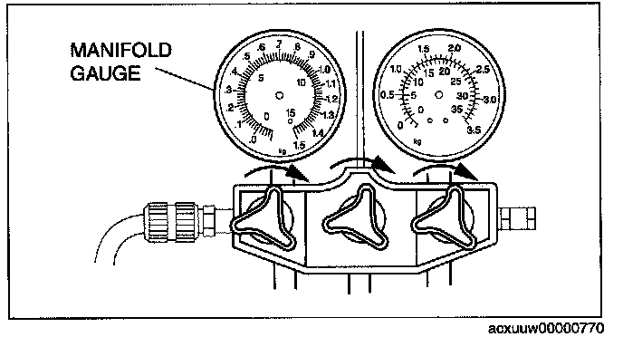3. Verify that high- and low-pressure side readings of the manifold gauge are at -101 kPa {-760 mmHg, -29.9 inHg). Close each valve of the manifold gauge.