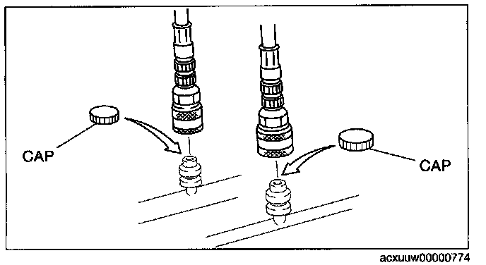 CAUTION: Always being charging of refrigerant from the high-pressure side. If changing is begun from the low-pressure side, the vanes of the A/C compressor will not be released and abnormal noise may result.