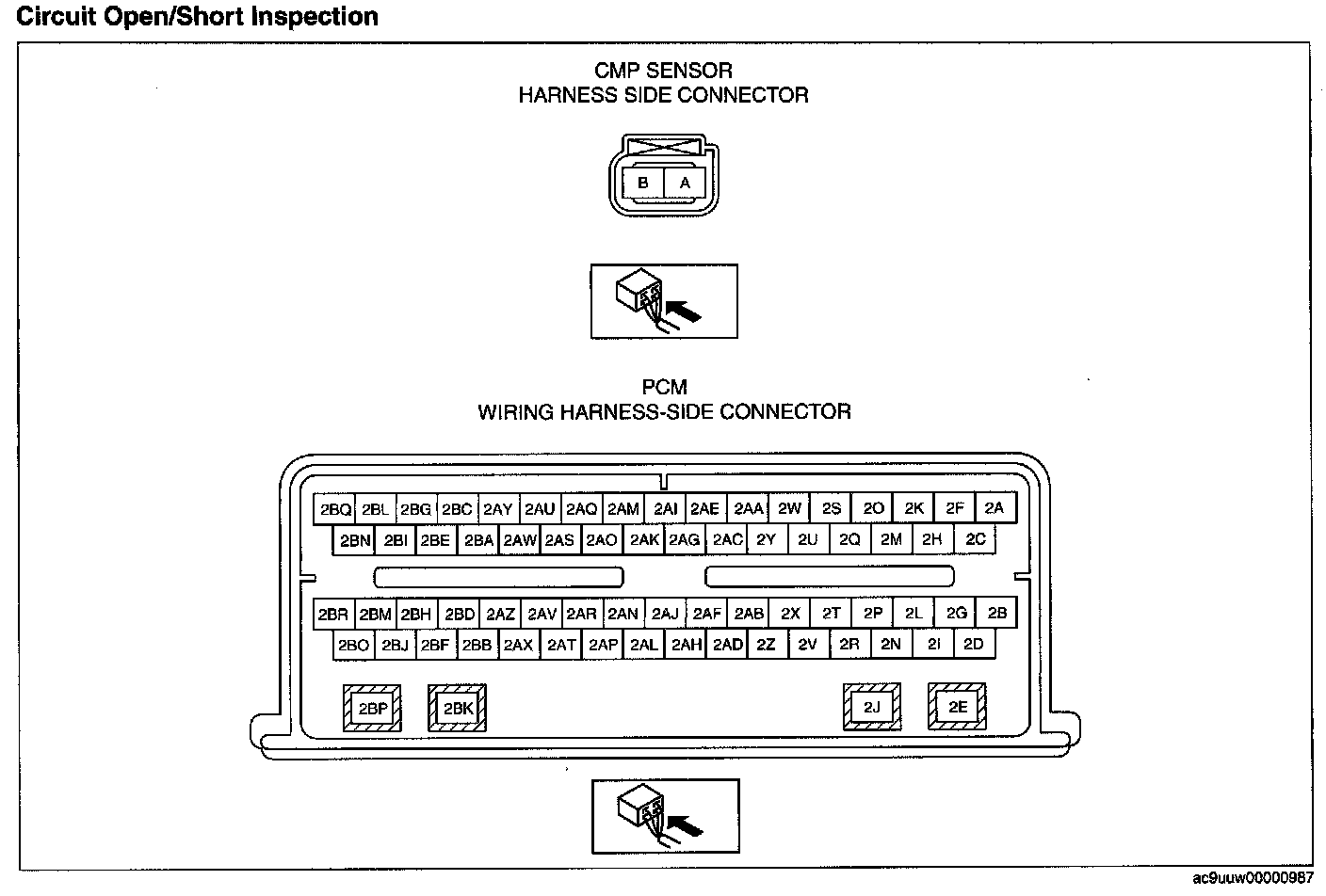 - CMP sensor (LH) terminal A and PCM terminal 2AB