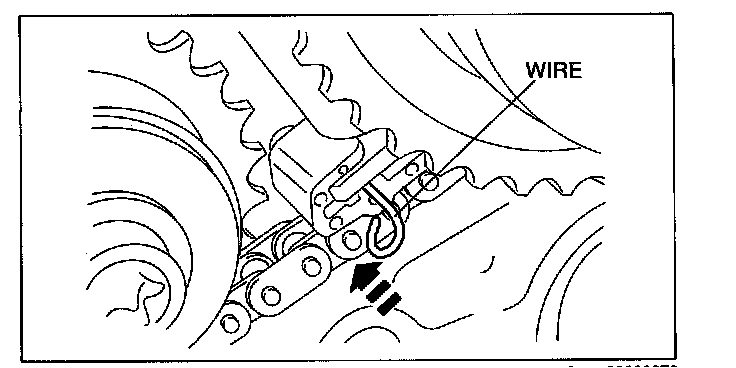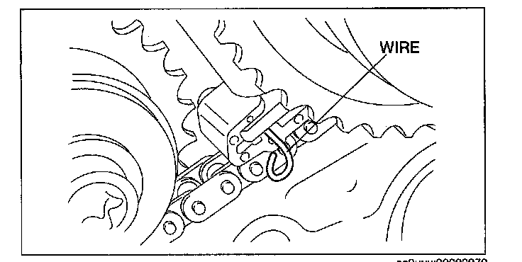 6. Remove the retaining wire inserted into the camshaft timing chain tensioner (LH).