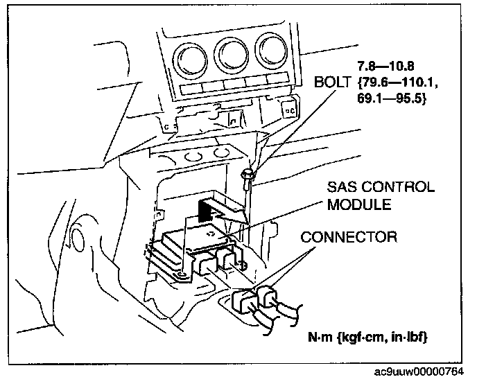 - Connecting the SAS control module with the SAS control module not securely fixed to the vehicle is dangerous. When the ignition switch is turned to the ON position, the SAS control module could tilt causing the SAS control module to detect that the vehicle is in a rollover condition, which may accidentally operate (deploy) the curtain air bag module and pre-tensioner seat belt. Therefore, before turning the ignition switch to the ON position with the connector connected, securely fix the SAS control module to the vehicle.