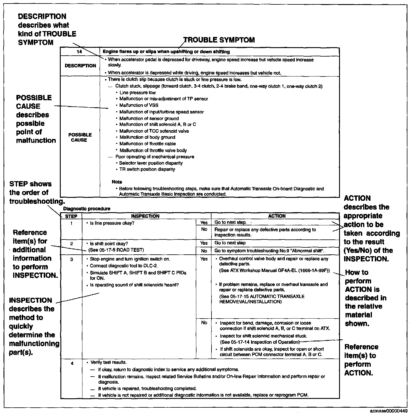 - Symptom troubleshooting shows diagnostic procedures, inspection methods, and proper action to be taken for each trouble symptom.