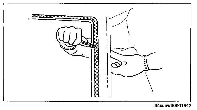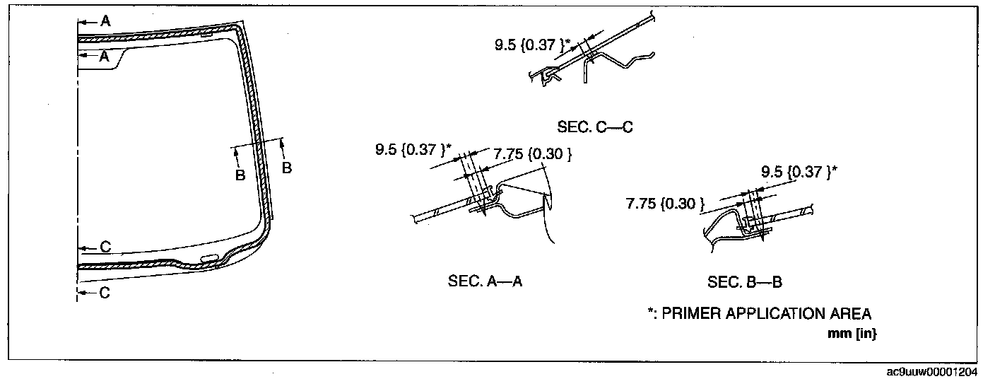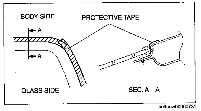 NOTE: Before removing the windshield from the body, mark the position of the windshield by affixing tape to the windshield and body panel.