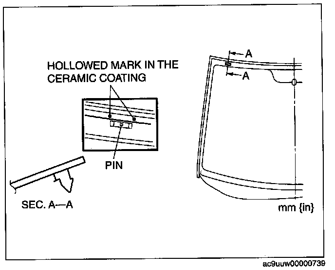 5. Align the marks made before removal and install the pin to the windshield referring to the figure. (when reusing the glass, and the pin was removed)