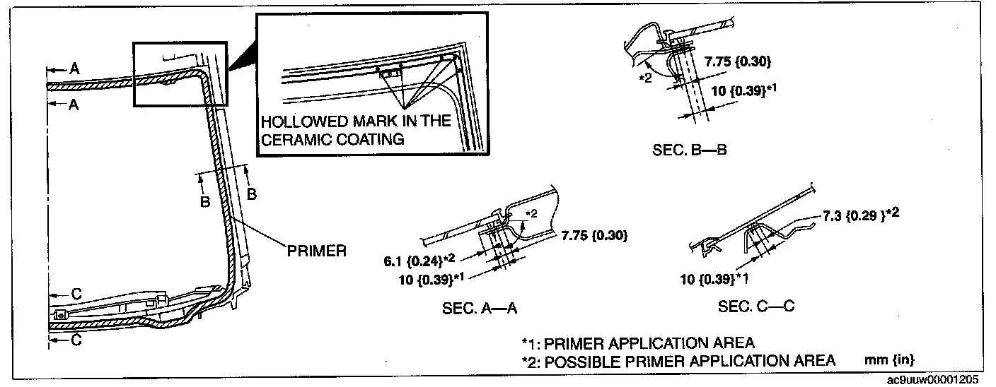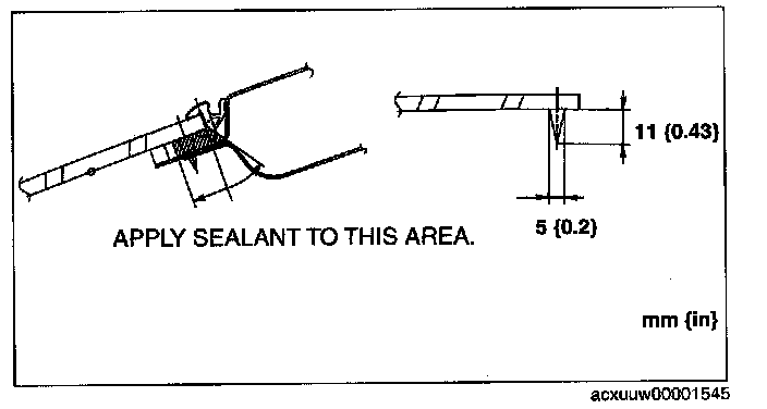 9. If the sealant has come off completely in any one place, apply some primer after degreasing, and allow it approx. 30 min to dry. Then apply 2 mm (0.08 in) thickness of new sealant.