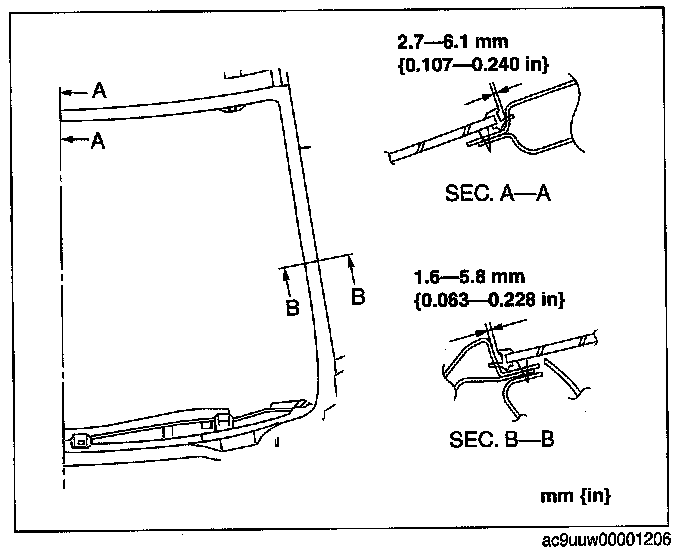 14. Verify that the clearance of the A-pillar is within the range shown in the figure, and press along the perimeter of the glass.