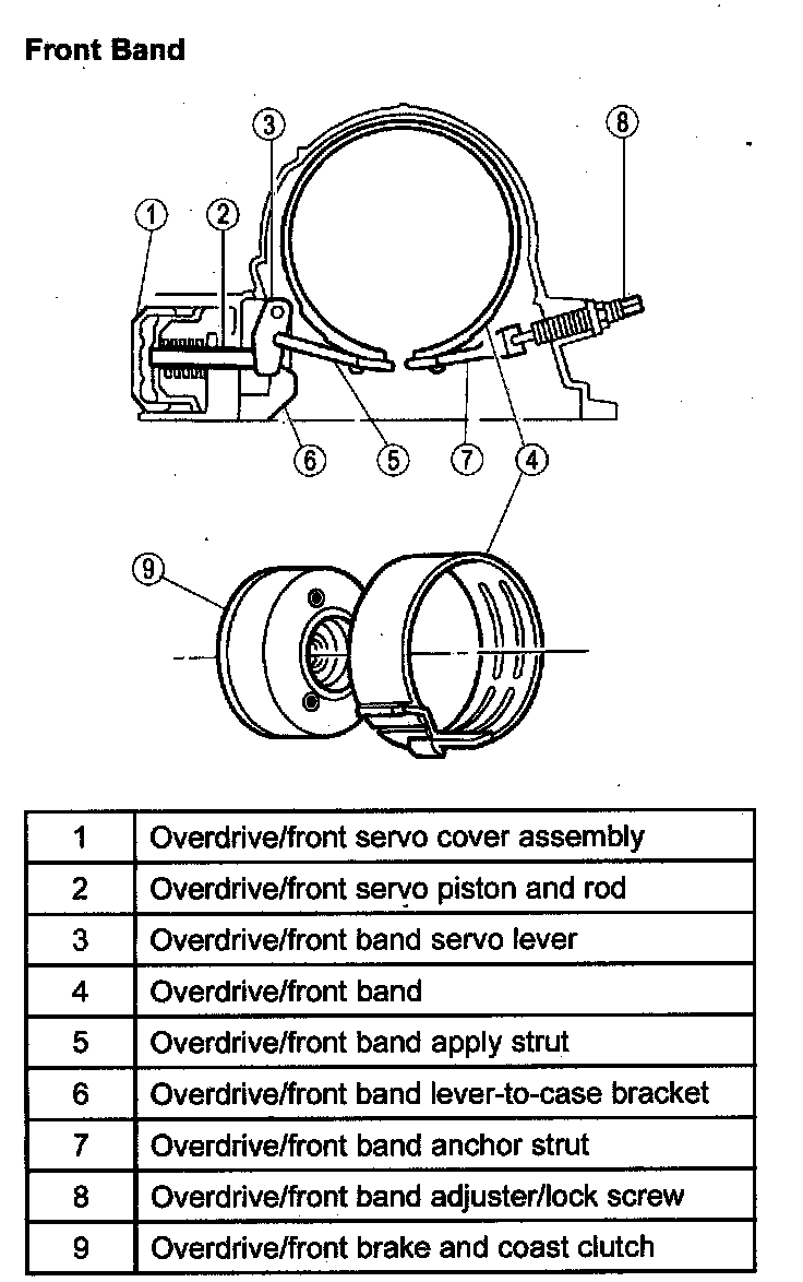 ^ The front band holds the front brake and coast clutch drum to the case in 2th and 5th gears.
