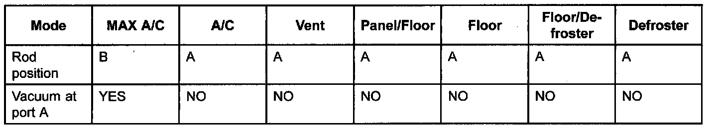 - If vacuum at port A appears in A/C, Vent, Panel/Floor, Floor, Floor/Defroster and Defroster modes, check the vacuum control valve.