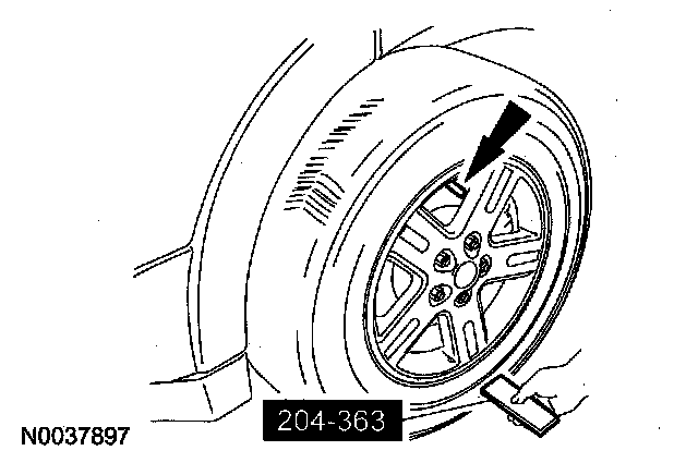 6. Place the activation tool on the LF tire sidewall opposite (180 degrees) from the valve stem. Press and release the test button on the special tool. The horn will sound briefly to indicate that the tire pressure sensor has been recognized by the SJB.