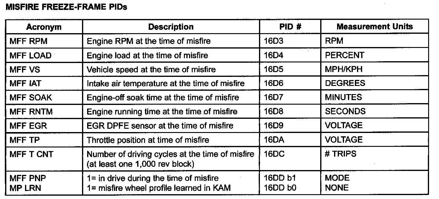Some unique parameters (PIDs) are stored in the keep alive memory of the PCM to help in diagnosing the root cause of misfires. These PIDs are collectively called misfire freeze-frame (MFF) data. These parameters are separate from the generic freeze-frame data that is stored for every MIL code. They are used for misfire diagnosis only. The MFF data is more useful for misfire diagnosis than the normal diagnosis only. It is captured at the time of the highest misfire rate and not when the DTC is stored at the end of a 1000 or 200 revolution block. (Generic freeze-frame data for misfire can be stored minutes after the misfire actually occurred).