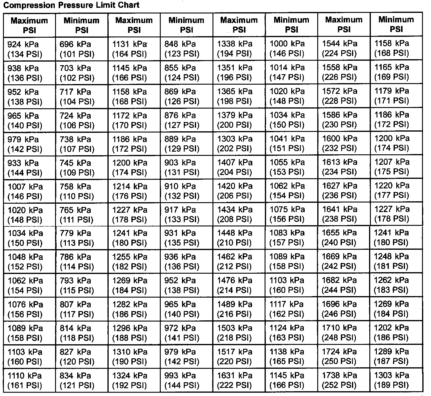 Compression Test - ResultsThe indicated compression pressures are considered within specification if the lowest reading cylinder is at least 75 percent of the highest reading. The following Compression Pressure Limit Chart shows acceptable pressure ranges. Use the highest compression reading obtained from the compression test and verify that the lowest compression reading is within the range shown in the chart. See the Compression Pressure Limit Chart.