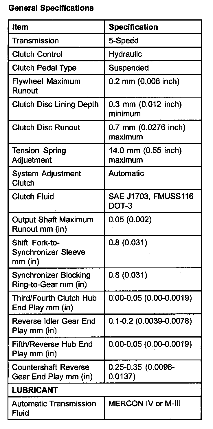 MANUAL TRANSMISSION AND CLUTCH SPECIFICATIONSGeneral Specifications