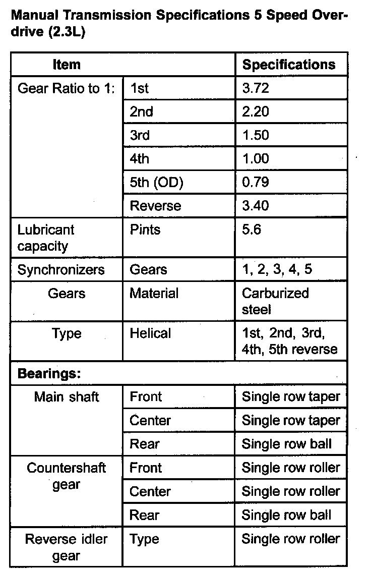 Manual Transmission Specifications 5 Speed Overdrive (2.3L):