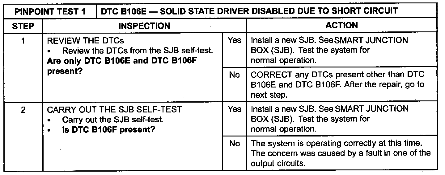 Pinpoint Test 1: DTC B106E - Solid State Driver Disabled Due to Short Circuit
