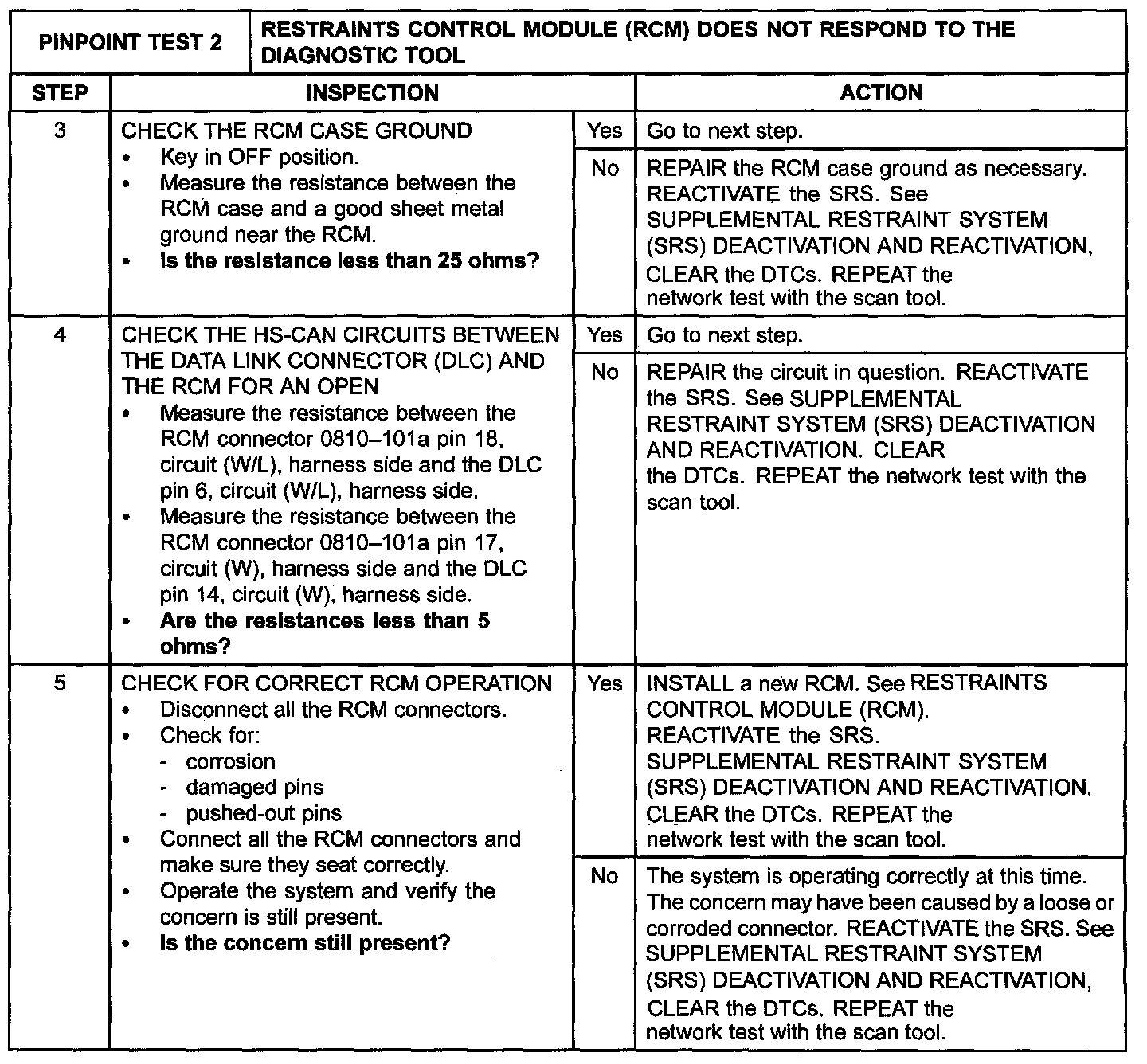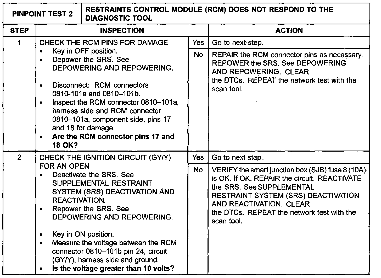 Pinpoint Test 2: Restraints Control Module (RCM) Does Not Respond to the Diagnostic Tool