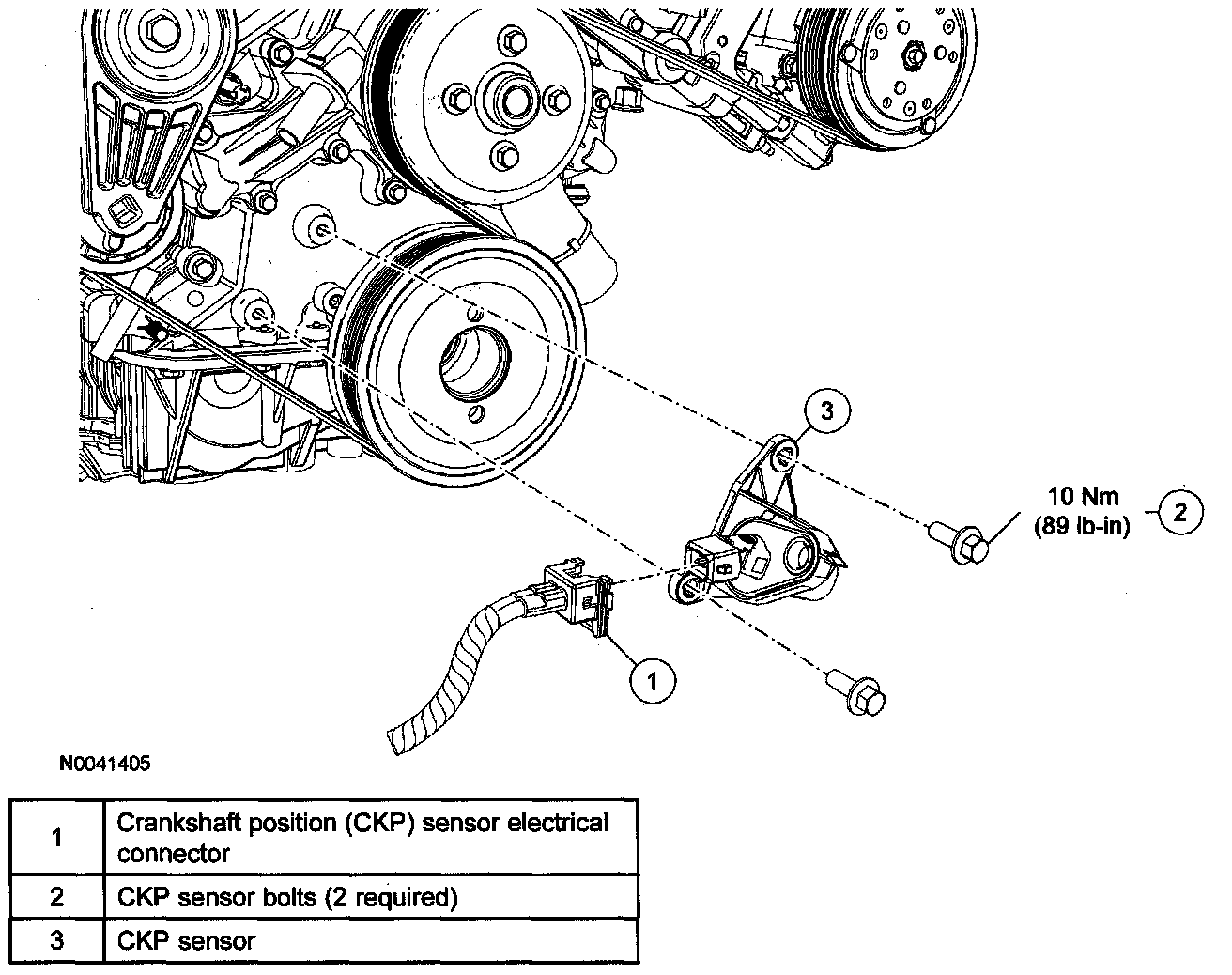 NOTE: The new CKP sensor must be touching the damper. The new sensor has wear tabs that will wear off after several engine revolutions.