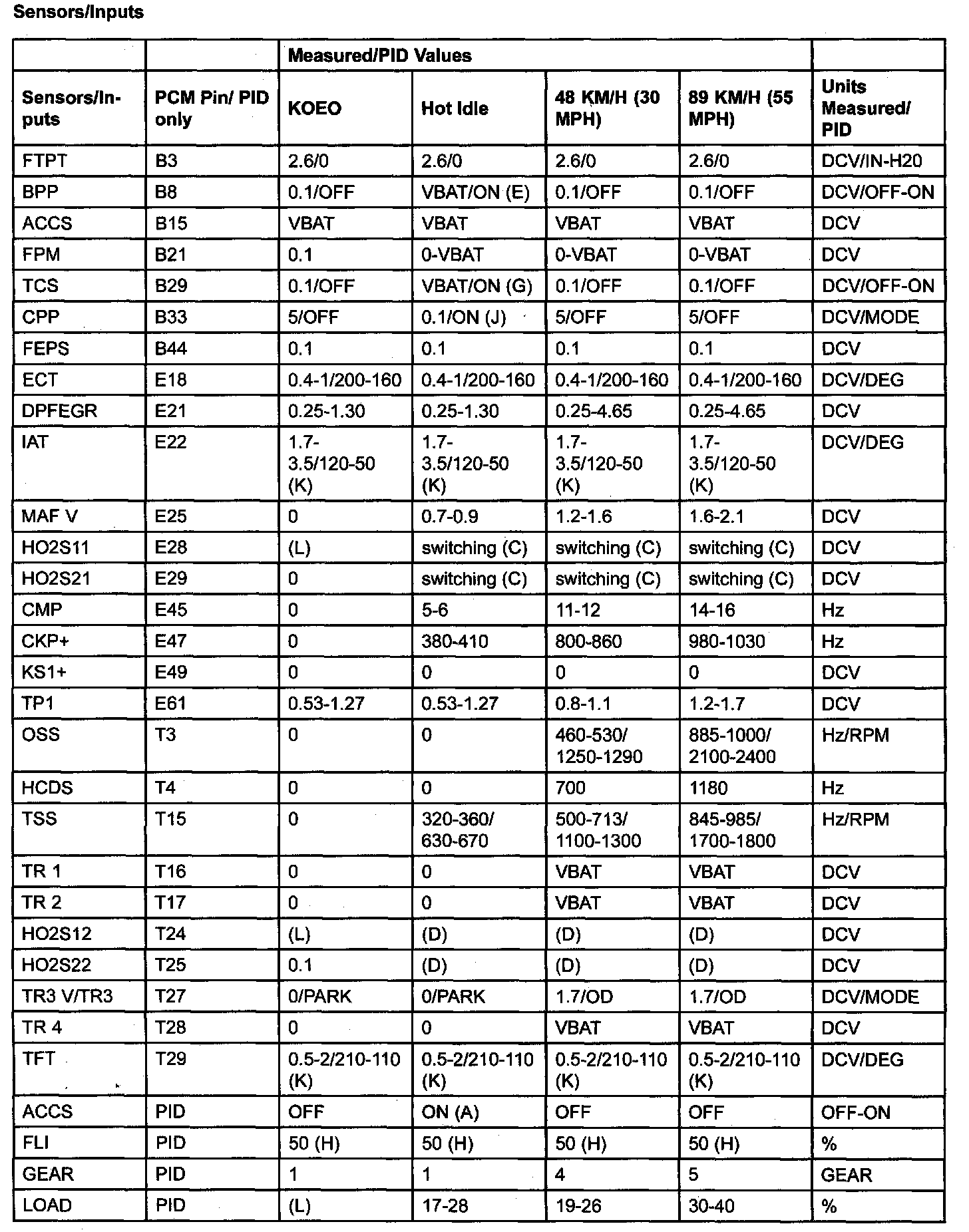 PID/DATA MONITOR ITEM TABLE