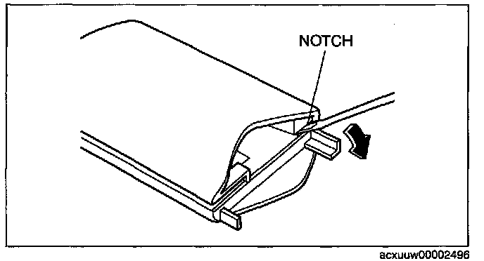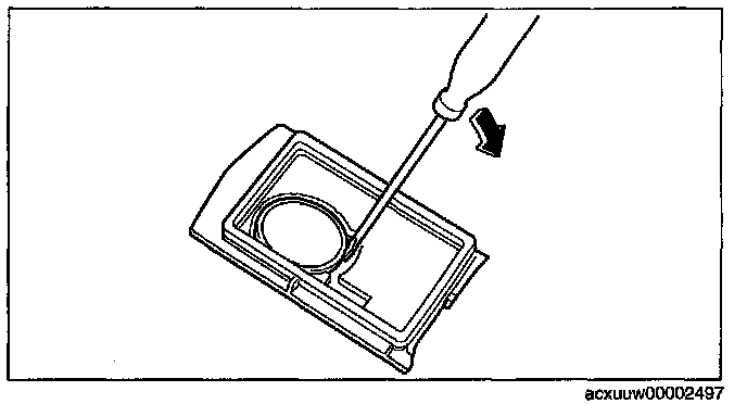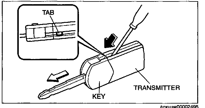 TRANSMITTER BATTERY REPLACEMENT [KEYLESS ENTRY SYSTEM]1. Insert a small flathead screwdriver into the transmitter notch and remove the key from the transmitter by pressing the tab.