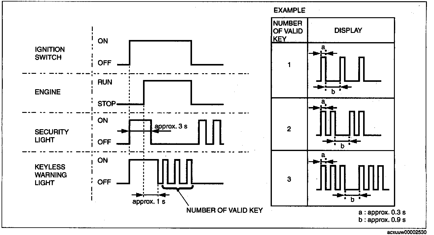 - From the point that ignition switch is turned to the ON position, the security light illuminates for approx. 3 s, and goes out.