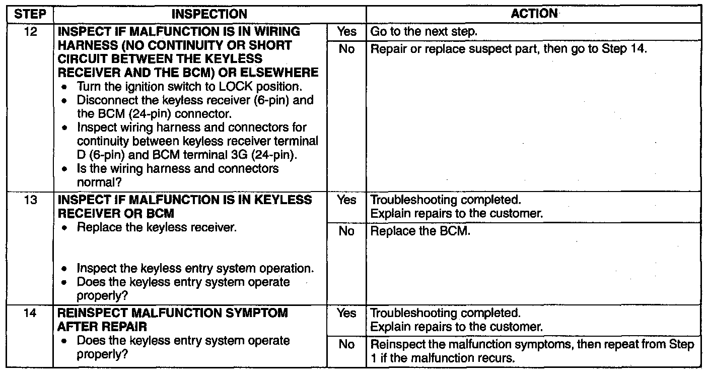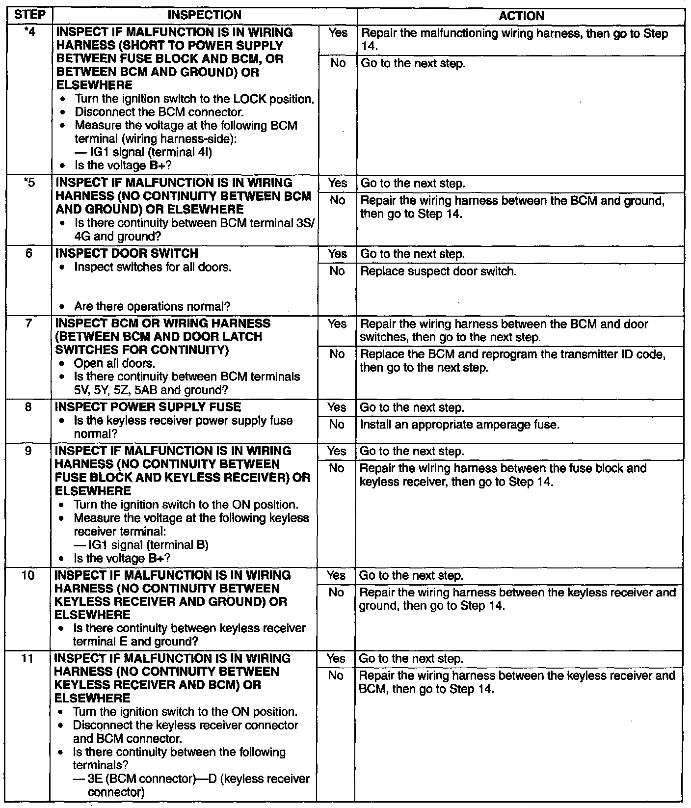 NO.2 ALL ON-BOARD DIAGNOSTIC FUNCTIONS INOPERATIVE [KEYLESS ENTRY SYSTEM]- When performing an asterisked (*) troubleshooting inspection, slightly shake the wiring harness and connectors while performing the inspection to discover whether poor contact points are the cause of any intermittent malfunctions. If there is a problem, verify that the connectors, terminals and wiring harnesses are connected correctly and undamaged.
