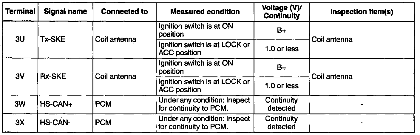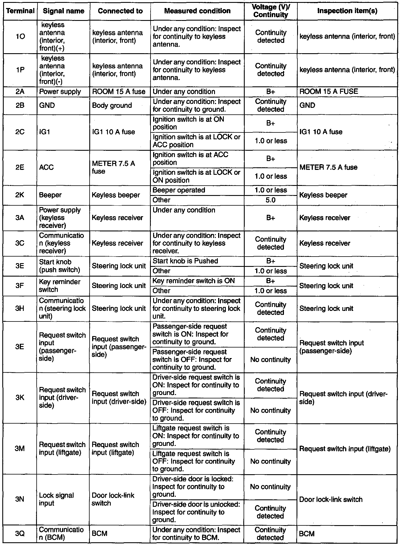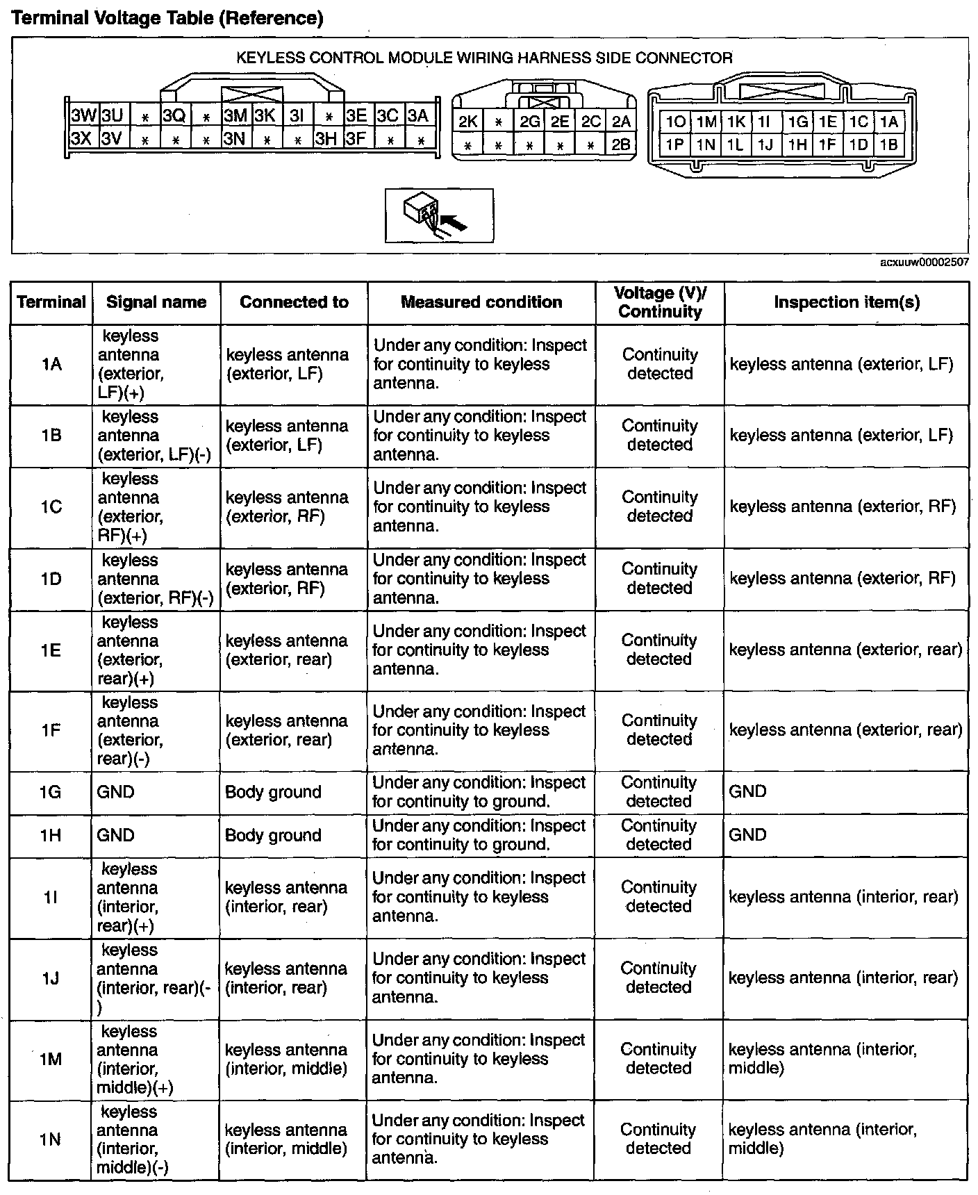 KEYLESS CONTROL MODULE INSPECTION [ADVANCED KEYLESS SYSTEM]1. Measure the voltage or inspect for continuity according to the Terminal Voltage Table (Reference).