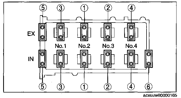 Install the camshaft caps and temporarily tighten the camshaft cap bolts evenly in two or three passes, and then tighten the camshaft cap bolts in two passes, using the following two steps and in the order shown in the figure.