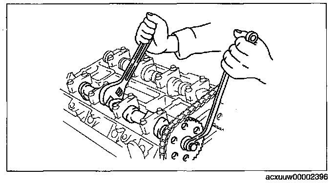 Fix the exhaust camshaft using a wrench on the cast hexagon, and tighten the sprocket installation bolt.