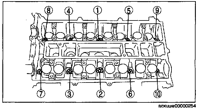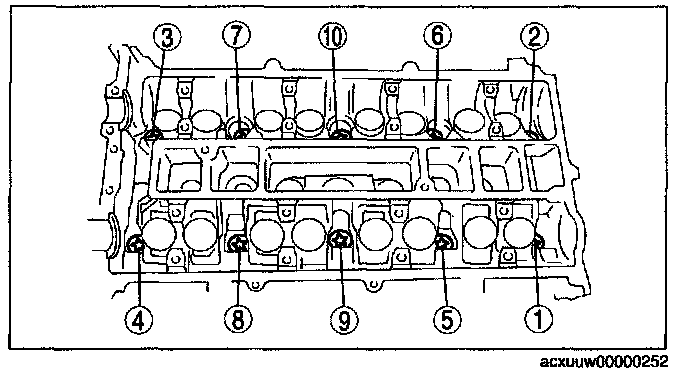 Cylinder Head BoltsLoosen the cylinder head installation bolts in two to three passes in the order shown in the figure and remove them.