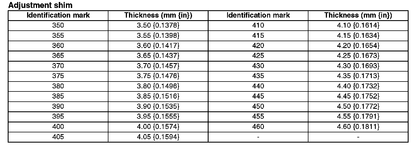 9. If the total thickness of the installed adjustment shims is not within the C range, select the appropriate number of adjustment shims from the table below and use them.
