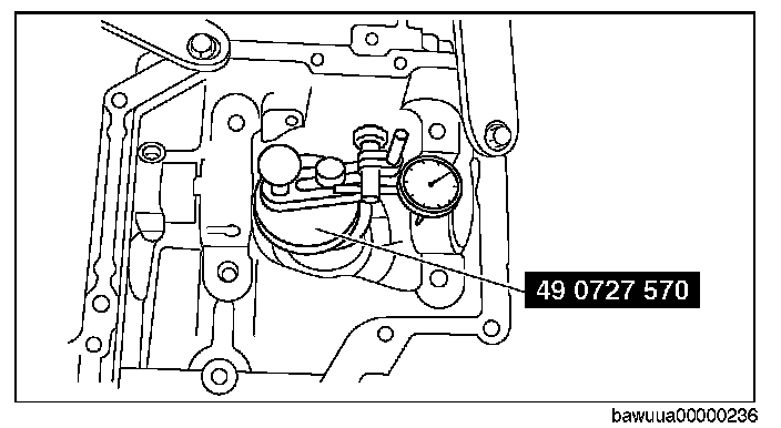 34. Set the dial gauge with the measuring probe attached perpendicularly to the end of one of the ring gear teeth.