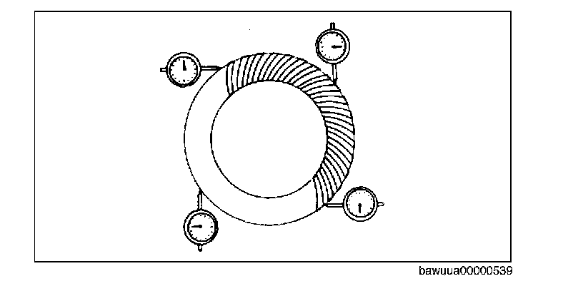 Caution: Perform the backlash measurement on the ring gear circumference at four points.