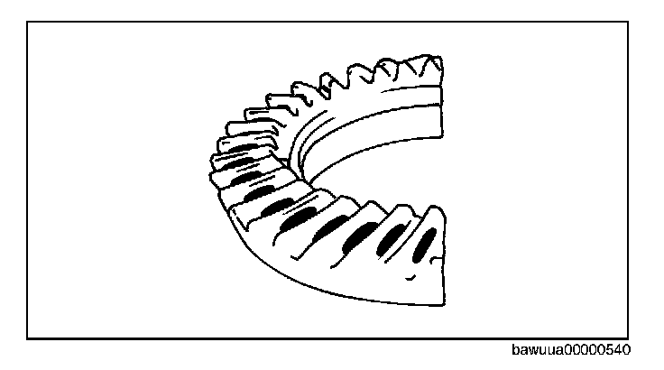 3) Inspect for gear tooth contact at four points on the ring gear circumference and verify that the gear tooth contact indicated by the tooth marking compound is as indicated in the figure.