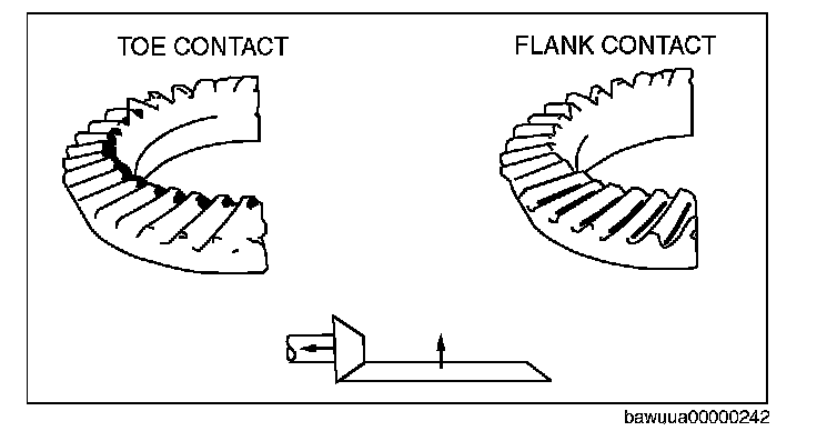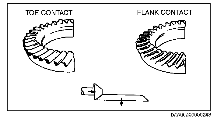 4) If toe and flank contact is indicated as shown in the figure, replace the drive pinion spacer with a thinner one to maintain the drive pinion further away.