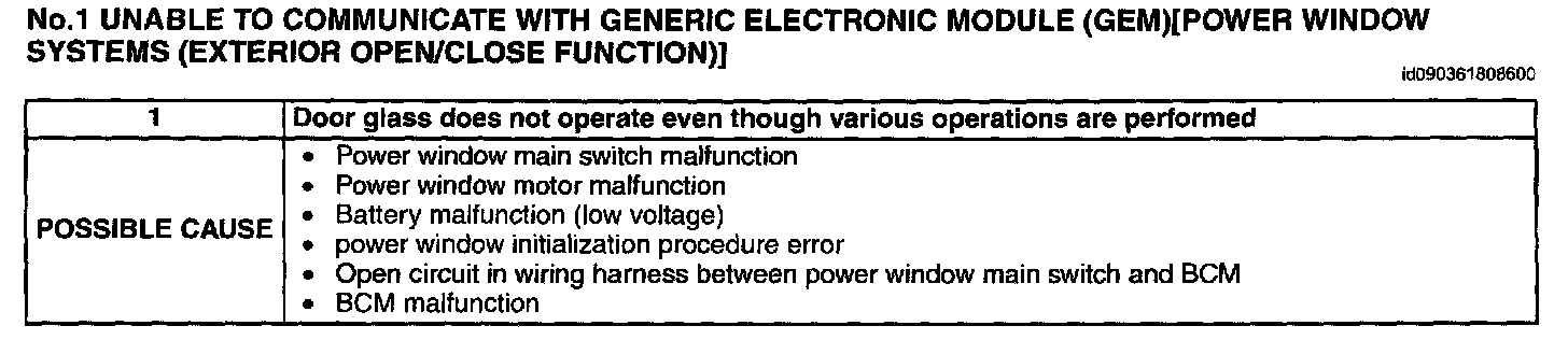 No.1 Unable to Communicate With Generic Electronic Module (Gem)[Power Window Systems (Exterior Open/Close Function)]