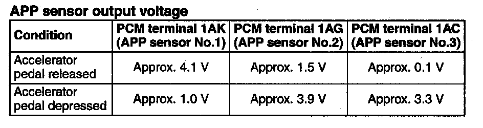 ACCELERATOR PEDAL POSITION (APP) SENSOR INSPECTION [MZI-3.7]NOTE: Before performing the following inspection, make sure to follow the procedure as indicated in the troubleshooting flowchart. (See HOW TO USE THIS MANUAL.)