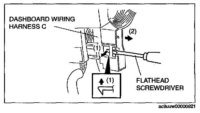 1. As shown in the figure, lift the tab in the direction of the arrow (1) using a tape-wrapped flathead screwdriver, and while keeping it lifted, pull it in the direction of the arrow (2) to remove.