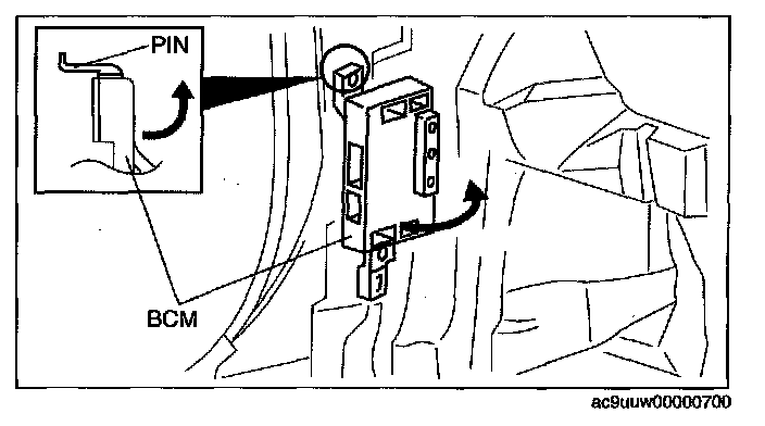 1. Raise the lower part of the BCM in the direction shown by the arrow and remove the pin with the BCM level.